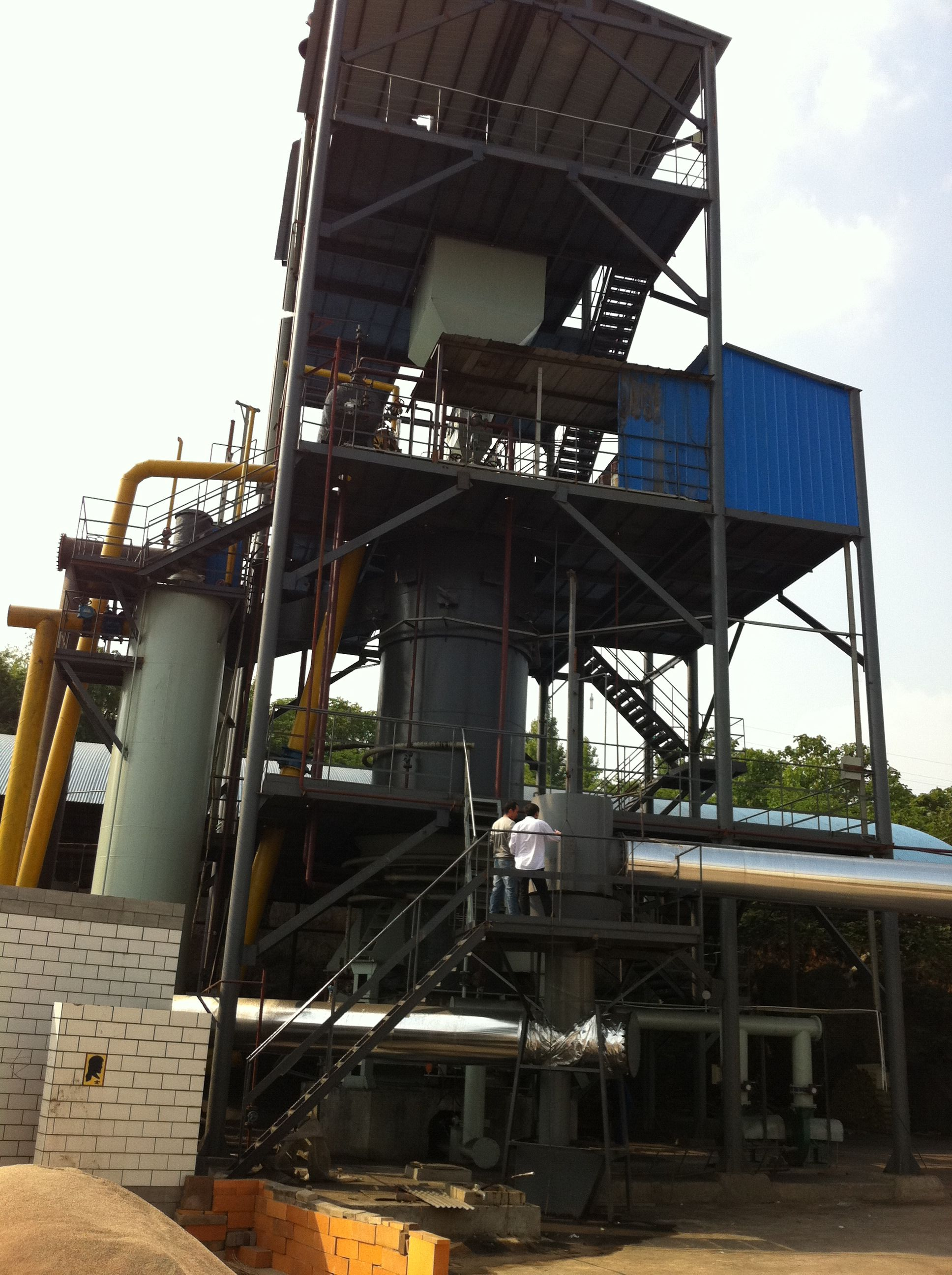 煤氣發生爐是將煤炭轉化為可燃性氣體——煤氣(主要成分為CO、H2、CH4等)的生產設備。工作原理為:將符合氣化工藝指標的煤炭篩選后,由加煤機加入到煤氣爐內,從爐底鼓入自產蒸汽與空氣混合物做為氣化劑。煤炭在爐內經物理、化學反應,生成可燃性氣體,上段煤氣經過旋風除油器、電捕器過濾焦油.下段煤氣經過旋風除塵器清除灰塵,經過混合后輸送到用戶使用。